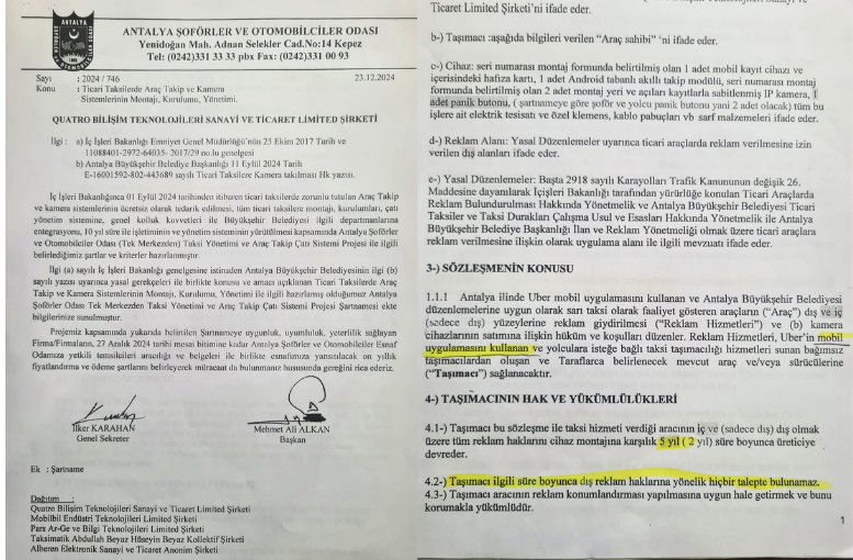 Sistemin Antalya’da işletilmesi için yurt dışı merkezli UBER’in, İstanbul merkezli Quatro Yazılım ve Teknoloji AŞ ile çalıştığı öğrenildi. Antalya’da şube açan Quatro’nun sahada birebir taksicilerle temas kurduğu, UBER ile bağlantılı ek sözleşmeler imzalattığı iddiaları gündeme geldi. Taksici esnafının tepkisine neden olan asıl unsurun, Quatro tarafından imzalatıldığı öne sürülen “Reklam Hizmetleri Sözleşmesi” olduğu belirtildi. İddialara göre bu sözleşme, kamera ve takip sistemlerinin kurulması karşılığında zorunlu tutuldu. Sözleşme kapsamında araçlara kamera, kayıt ve takip sistemleri takılması taahhüt edilirken, bunun karşılığında taksicilerin UBER sistemini kullanması şart koşuldu.