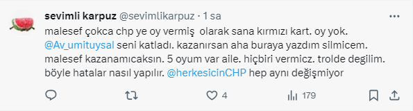 Sevimli Karpuz rumuzlu bir kullanıcı ise  yaptığı paylaşımda "Maalesef çokça CHP ye oy vermiş  olarak sana kırmızı kart. oy yok. Ümit Uysal seni katladı. kazanırsan aha buraya yazdım silmeyeceğim. Maalesef kazanamayacaksın. 5 oyum var aile. hiçbiri vermeyeceğiz trolde değilim.  böyle hatalar nasıl yapılır. CHP  hep aynı değişmiyor" dedi.