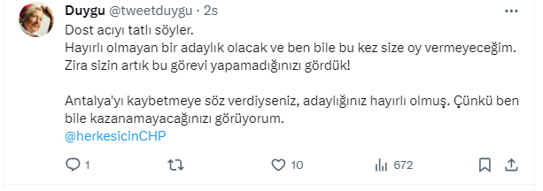 Duygu isimli bir sosyal medya kullanıcısı yaptığı paylaşımında, “Dost acıyı tatlı söyler. Hayırlı olmayan bir adaylık olacak ve ben bile bu kez size oy vermeyeceğim. Zira sizin artık bu görevi yapamadığınızı gördük! Antalya'yı kaybetmeye söz verdiyseniz, adaylığınız hayırlı olmuş. Çünkü ben bile kazanamayacağınızı görüyorum” diyerek görüşlerini dile getirdi.