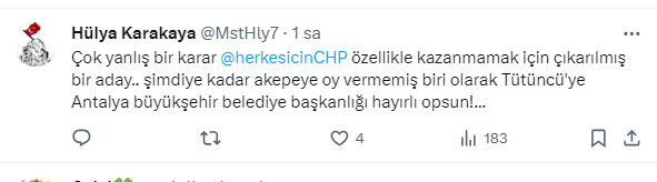Altay isimli bir diğer kullanıcı, “Tabana rağmen aday gösterilmişsiniz. Antalya'yı kaybederseniz bunun siyasi sorumluluğunu ömür boyu taşırsın” derken, Hülya Karakaya ise, “Çok yanlış bir karar CHP özellikle kazanmamak için çıkarılmış bir aday. Şimdiye kadar AK Parti’ye oy vermemiş biri olarak Hakan Tütüncü'ye  Antalya Büyükşehir Belediye Başkanlığı hayırlı olsun” şeklinde paylaşım yaptı.
