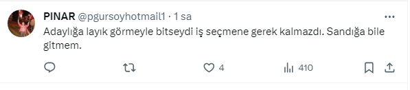 Pınar isimli sosyal medya hesabından da, “Adaylığa layık görmeyle bitseydi iş seçmene gerek kalmazdı. Sandığa bile gitmem” diyerek tepkisini paylaştı.