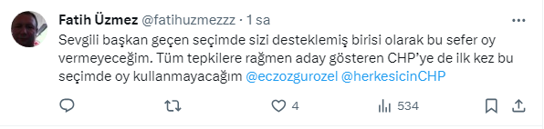 Fatih Üzmez isimli kullanıcı ise, “Sevgili başkan; geçen seçimde sizi desteklemiş birisi olarak bu sefer oy vermeyeceğim. Tüm tepkilere rağmen aday gösteren CHP’ye de ilk kez bu seçimde oy kullanmayacağım” ifadelerini kullandı.
