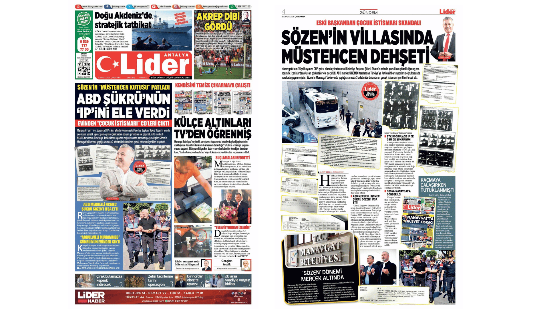 Lider Gazete, Türk basın tarihinde eşine az rastlanır bir araştırmacı gazetecilik örneği sergileyerek, çocuk istismarı içerikli materyallerin Şükrü Sözen adına kayıtlı internet hattından yüklendiğini belge belge ortaya koydu. “ABD Şükrü’nün IP’sini Ele Verdi” manşetiyle Türkiye gündemini sarsan haberde, ABD makamlarının doğrudan Türk savcılığa ilettiği IP kayıtları ve adres bilgileriyle, yüklemelerin Manavgat’taki Şükrü Sözen’e ait ev adresinden yapıldığı kesin olarak kanıtlandı.