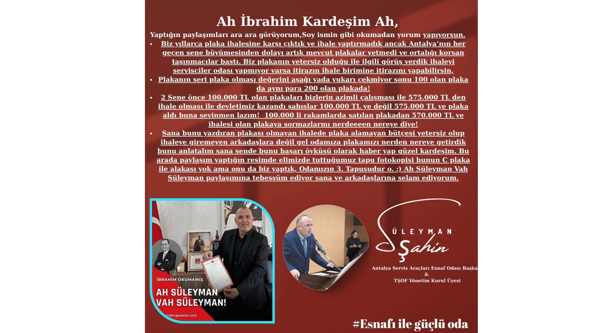 Servisçiler Odası Başkanı ‘MUHTEŞEM SÜLEYMAN’ sanal medyadan yaptığı açıklama ile benim soyadım ile alay etmesinin dışında hiç bir soruma cevap vermediği açık ve nettir. Ben ona Milli Eğitim Müdürlüğü ile yapılan protokolü kendi keyfi ve seçim malzemesi olarak kullandığını iddia ettim. Çünkü canı yanan birçok servisçi bana dert yandı.